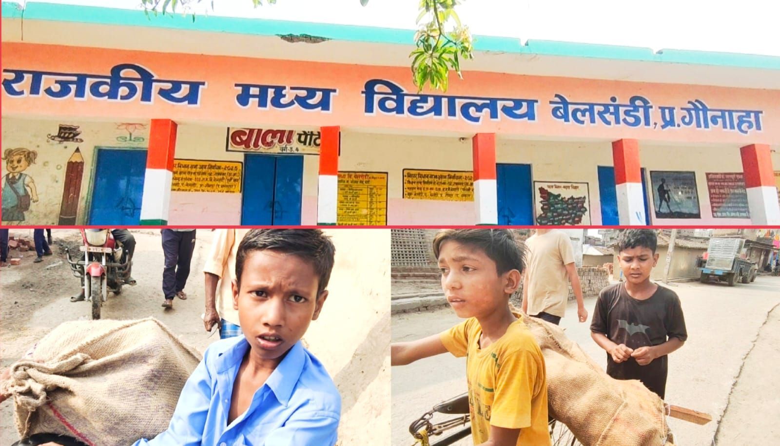पढ़ाई की जगह रा. म. बि. बेलसंडी के बच्चों से कराया जा रहा लकड़ी ढोने का कार्य