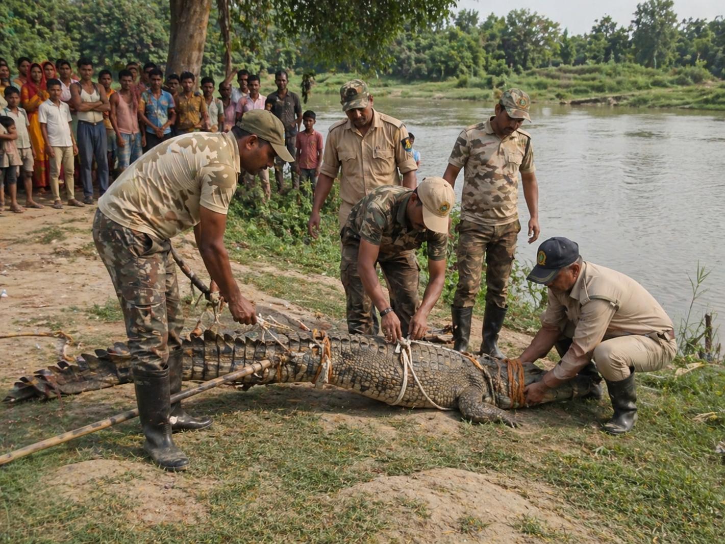 बगहा के बेलहवा गांव में मगरमच्छ का रेस्क्यू, वन विभाग ने सुरक्षित गंडक नदी में छोड़ा