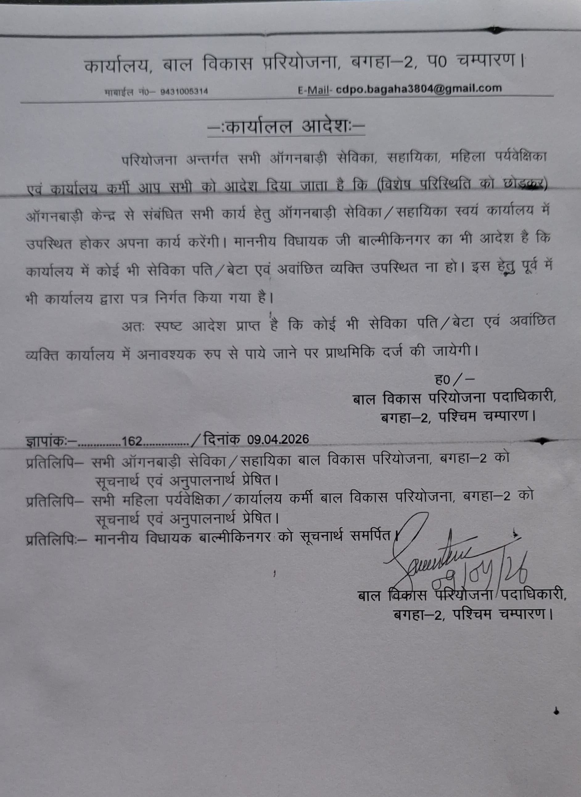 बगहा दो बाल विकास परियोजना पदाधिकारी सावित्री दास ने बिचौलियों पर लगाम लगाने और कार्यालय के कार्यों को सुचारू रखने के उद्देश्य से आदेश पारित करते हुए सभी सेविकाओं सहायिकाओं को निर्देश दिया है कि कार्यालय संबंधी किसी भी कार्य में सेविका या सहायिका स्वयं उपस्थित हो, उनके पति या बेटे उपस्थित ना हों। इसमें उन्होंने वाल्मीकि नगर विधायक सुरेंद्र प्रसाद के आदेश का भी जिक्र किया है। यह आदेश पारित करने का उद्देश्य है कि सेविका/ सहायिका के पति या बेटे जब कार्यालय में उपस्थित होते हैं तो उनकी आड़ में कई बिचौलिए कार्यालय के कार्य को बाधित करने का प्रयास करते हैं। विगत कई महीनो से इसकी शिकायत है विधायक के पास आ रही थी। इसके निराकरण के लिए उन्होंने बाल विकास परियोजना पदाधिकारी सावित्री दास से बात की और उक्त आदेश पारित किया गया है।